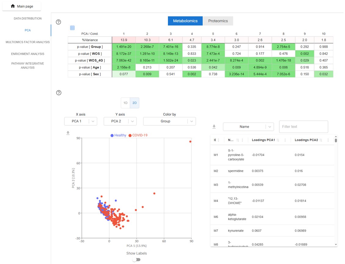 Users can also select specific principal components to visualize sample scores in one- or two-dimensional scatter plots. Additionally, an interactive table of PCA loadings is provided, highlighting the contribution of each biomolecule to each principal component.